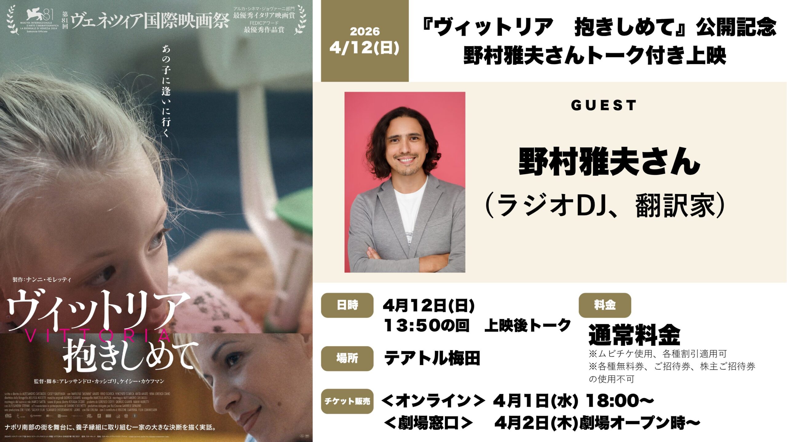 『ヴィットリア 抱きしめて』の公開を記念して、ラジオDJ、翻訳家の野村雅夫さんにご登壇いただくトーク付き上映イベントを開催いたします!